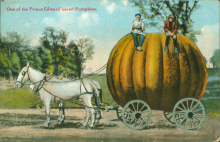 For the 4th day of the 12 Days of PEI Postcards we have another tall-tale postcard, but with a fairy-tale twist. This postcard sent in 1911 features a pumpkin carriage pulled by a team of horses. As we know from the fairy-tale Cinderella, the fairy godmother turns the pumpkin into a carriage. We're unsure of the connection between this postcard and the fairy-tale, other than to promote large pumpkins in PEI, but we can assume that the pumpkin was drawn past midnight...