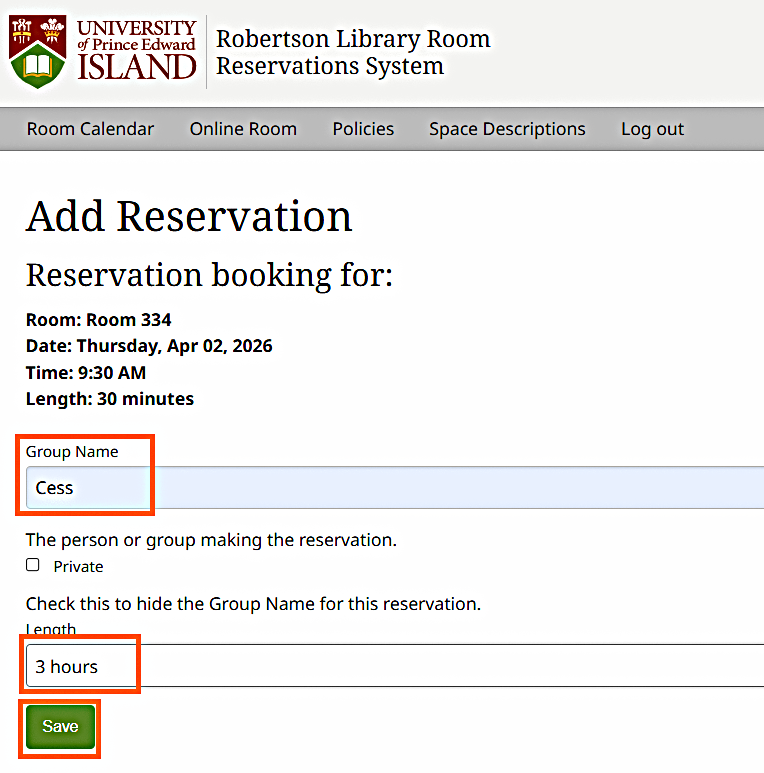 Enter your name or group name in the provided space. Choose your reservation length, from 30 minutes up to a maximum of 3 hours. Click Save to confirm your booking.