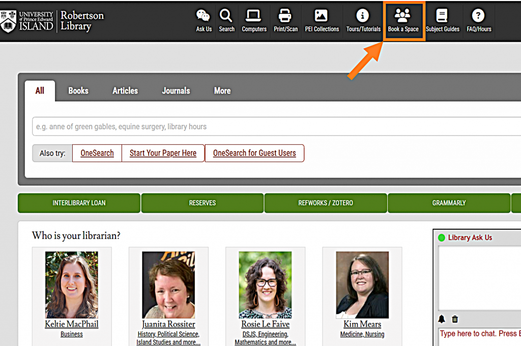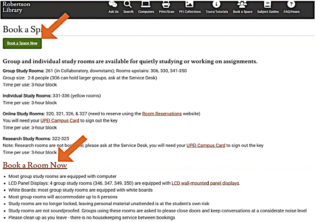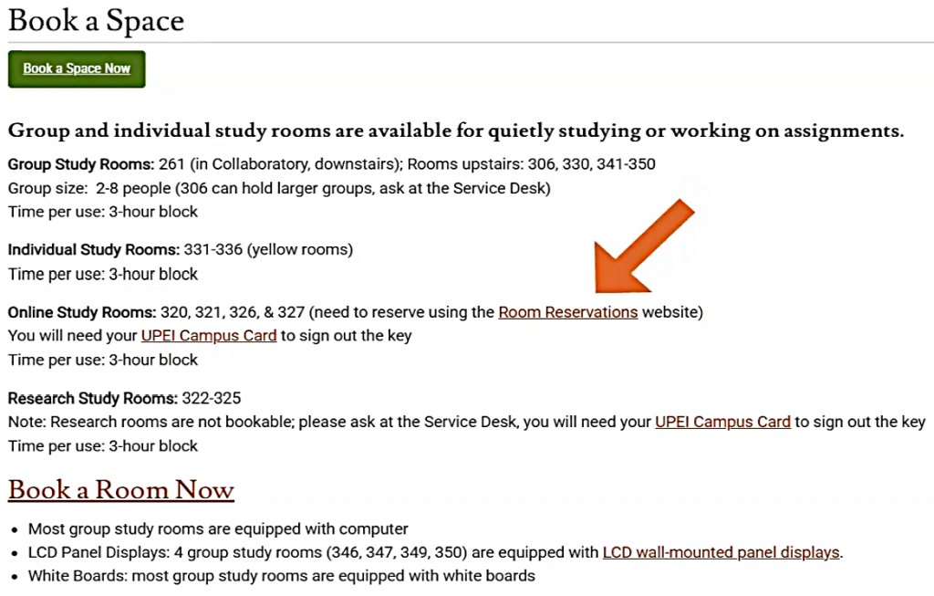 If your plans change and you no longer need the room, please cancel your reservation to free up the space for others. You can cancel by sending a message through the Library Ask Us chat, visiting the Service Desk, calling us at 902-566-0583 or emailing us at reference@upei.ca.
