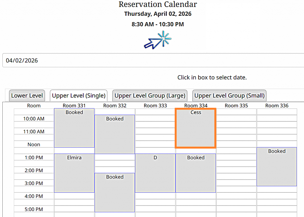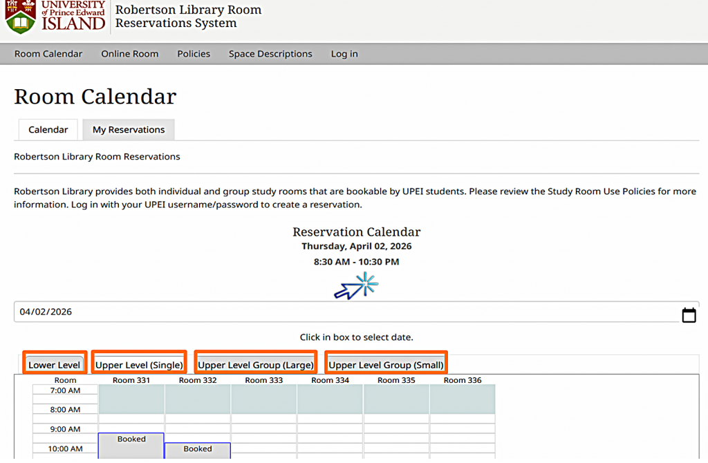 For example, to book a single study room, click the tab labeled "Upper Level (Single)." The room numbers will show up. Gray time slots indicate the room is already booked for that time.