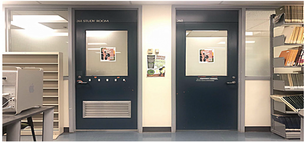 Group Study Rooms 260 & 261 are located on the first floor in the Collaboratory Area.