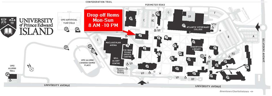 As of Monday, December 7, 2020, items should be returned to the Utility/Security building on the UPEI Campus (see map below). If you need to return library items that you currently have on loan, then you can return them at that building between the hours of 8AM - 10PM. When returning your items please maintain social distancing standards.