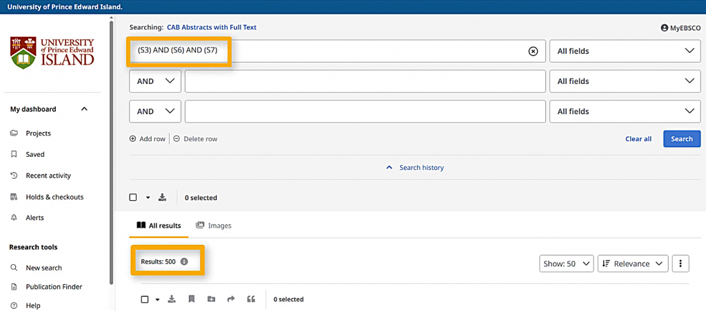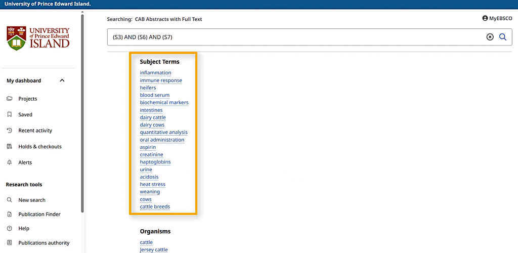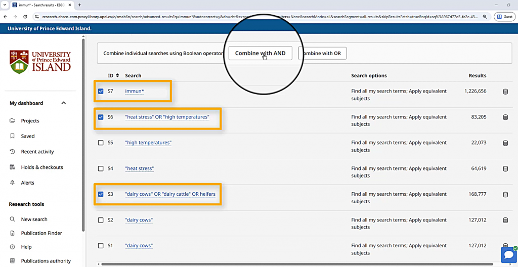 When I choose “Combine with AND,” a new search string will appear in my search box, referring to my past searches only by their numbers. This search gets about 500 search results, which should all have something to do with dairy cows, hot weather, and something related to the immune system.