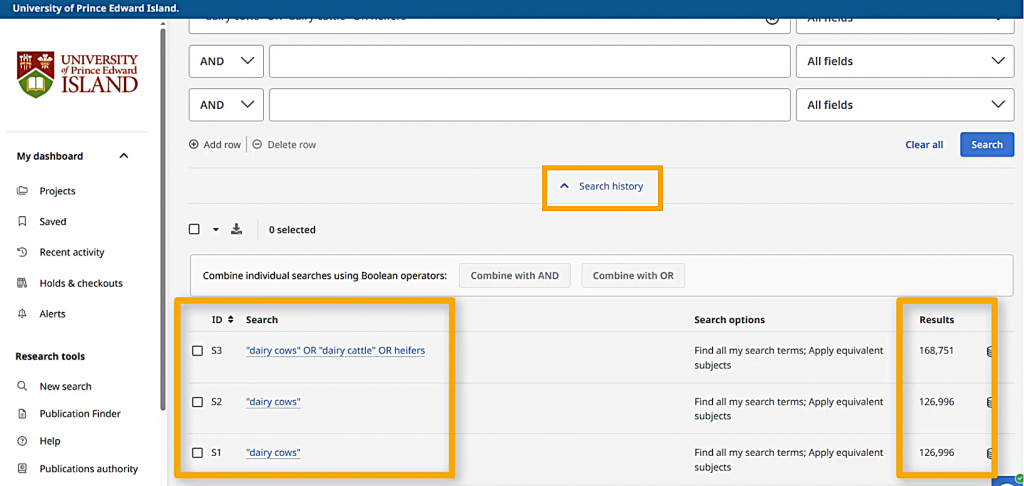 Finally, I’ll use the search history function to combine the different aspects of my search. Before I start, I’ll use the “Clear all” option again. Then, I’ll choose my favourite search for dairy cows, my favourite search for heat stress, and my favourite search for immune system. I want to combine these using AND. That means that a good search result will include a term from each of the searches I’ve picked.