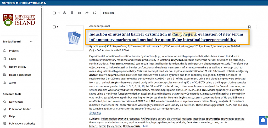 If I want to know more about a specific search result, the “show more” and “plus more” links show me more of the abstract and all of the subject terms.