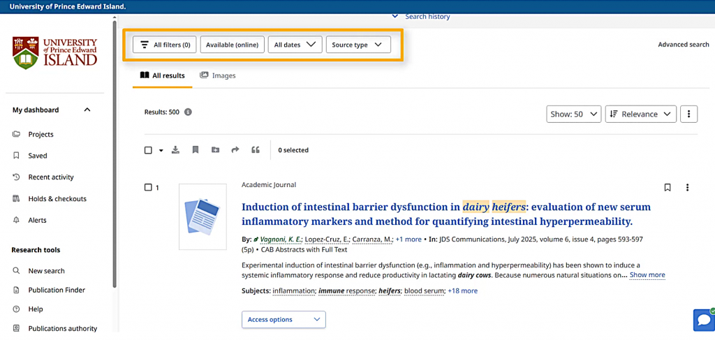 For example, I can choose only the results that are from Academic Journals by using the “Source type” option.