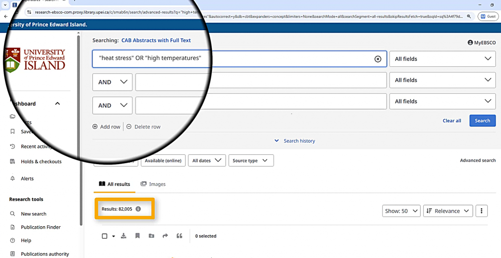 A search for “heat stress” OR “high temperatures” gets about 82,000 results, which tells me that those terms are pulling a lot of different articles.