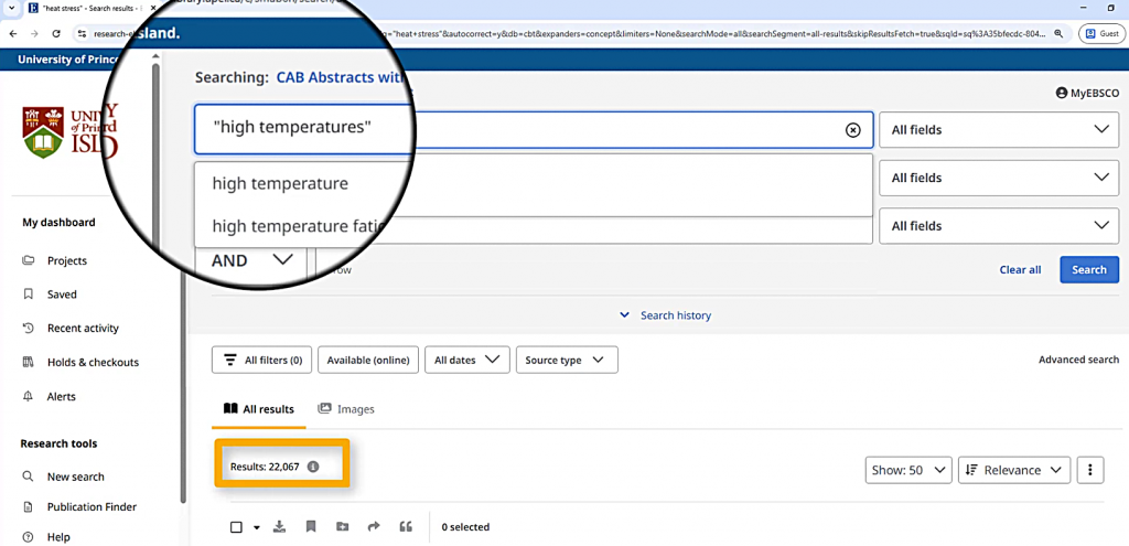 Next, I want to work on my search term about heat stress. The “Clear all” option gets rid of my previous search terms.