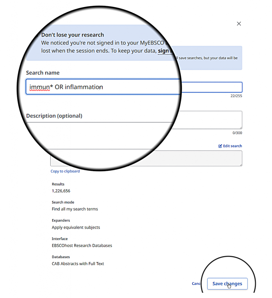 I can open the “Search history” dropdown and choose “Edit search details” from the menu next to my immune-related search if I want to add this term. On the “Search details” page, I need to use the “Edit search” option to update the greyed-out Query box.