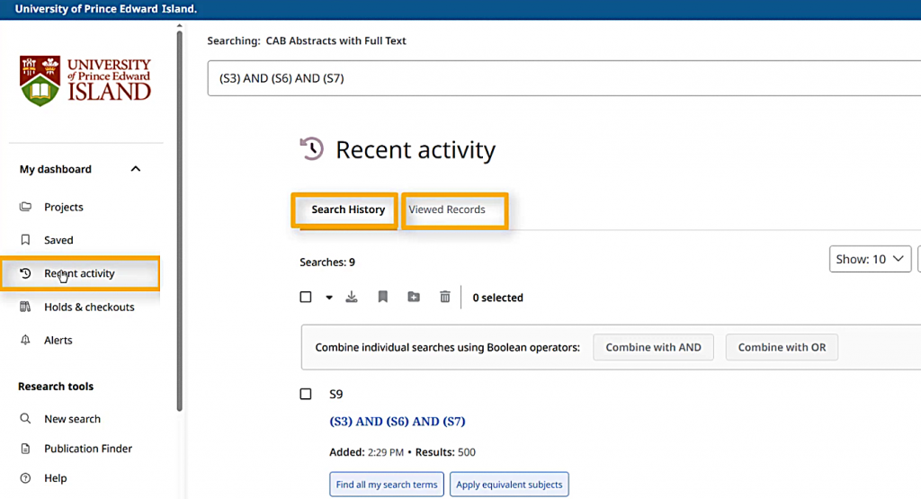 If I want to see an article that I clicked on earlier, I can use the “Recent Activity” section in the menu on the left side of the page. On this page, there are two sections: Search History and Viewed Records. Search History is a list of all the searches I’ve run in this session, with the option to run them again by clicking on the search terms. The “Viewed Records” list shows the item records I’ve opened during this session.