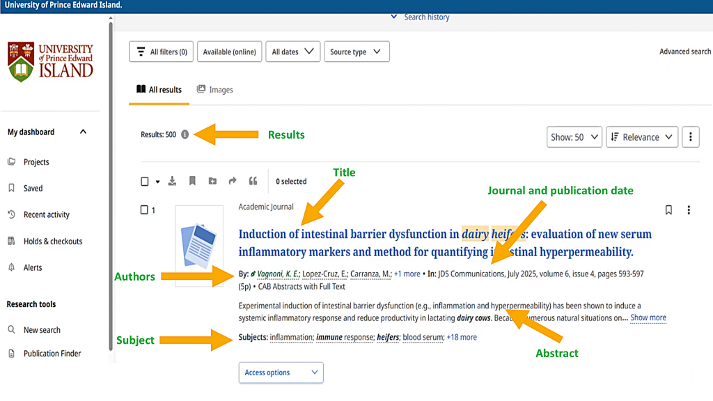 Each item has a dropdown menu labeled “Access options.” I can access the full text by choosing a link that mentions "full text," a file format such as PDF, or "Check@UPEI (Full Text Finder)". Different items might have different sets of links. The PDF and “Online full text” links will open in the current tab, while other links will open in a new tab or window.