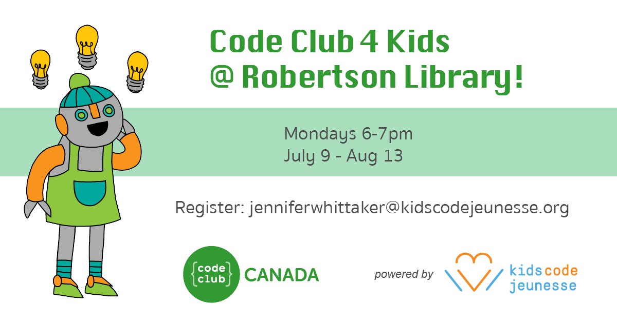 Do you know any 8-12 year olds who like computer games? Come to Code Club at the Robertson Library, a six-week program to explore the basics of computer programming using Scratch! You can make games, animations, and tons more!