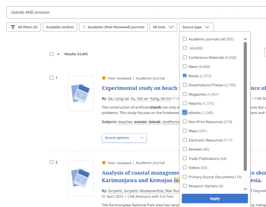 To find books on a particular topic, begin with a keyword search in OneSearch. Then, choose the "Books" and "eBooks" options from the 'Source Type' filter.