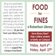 Bring non-perishable food or grocery items (e.g. canned goods, pasta, light bulbs, toilet paper, etc.- please no damaged, expired, or opened goods) for the Campus Food Bank to the Service Desk at the Library from Friday, April 6th to Friday, April 27th, 2018 and we’ll deduct $2.00 per item from your library fines.