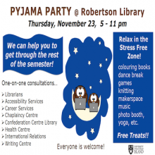 Robertson Library is hosting a Pyjama Party in the Library on Thursday, November 23rd, 5 - 11 pm as part of UPEI's Health and Fitness Week, November 20th - 25th,