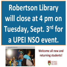 Robertson Library will close at 4 pm on Tuesday, September 3rd for a UPEI NSO event.