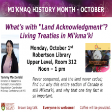 Join us for a brown bag talk by Tammy MacDonald, Director of Research and Outreach; Consultation Negotiation Coordinator Mi’kmaq Confederacy OF PEI.