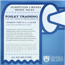 Robertson Library Movie Talks and Dr. Ann Braithwaite present the video documentary, "Toilet Training (Law and Order in the bathroom)" on Monday, March 5 at 4:30 pm.