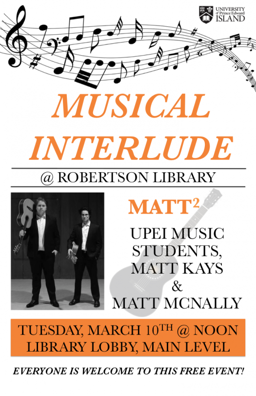 Robertson Library is pleased to host guitar duo Matt2, UPEI music students Matt Kays and Matt McNally, for a noontime performance in the Lobby of the Library on Tuesday, March 10th.