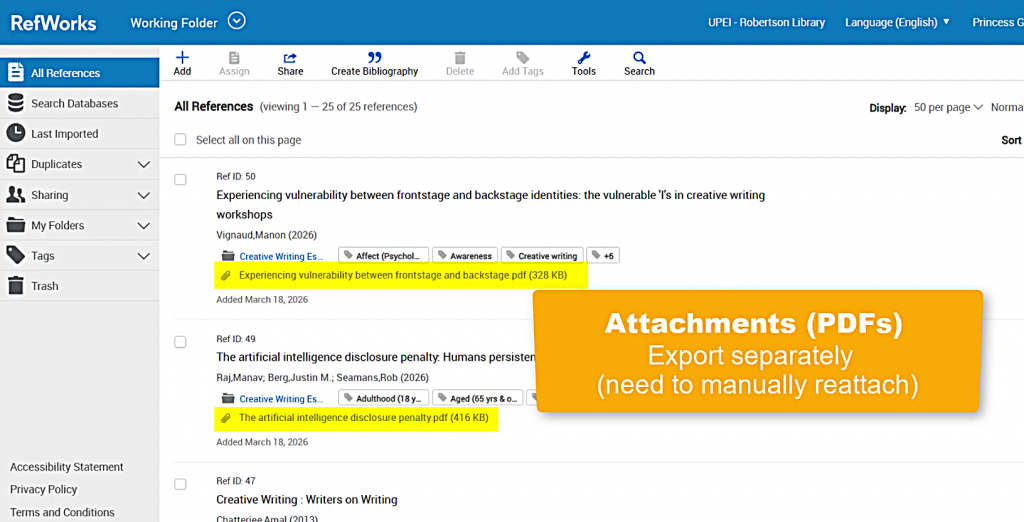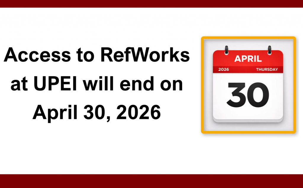UPEI users will lose access to RefWorks after April 30, 2026. While we had originally scheduled this cancellation for 2027, a cut to the Library’s budget has moved it up by a year.
