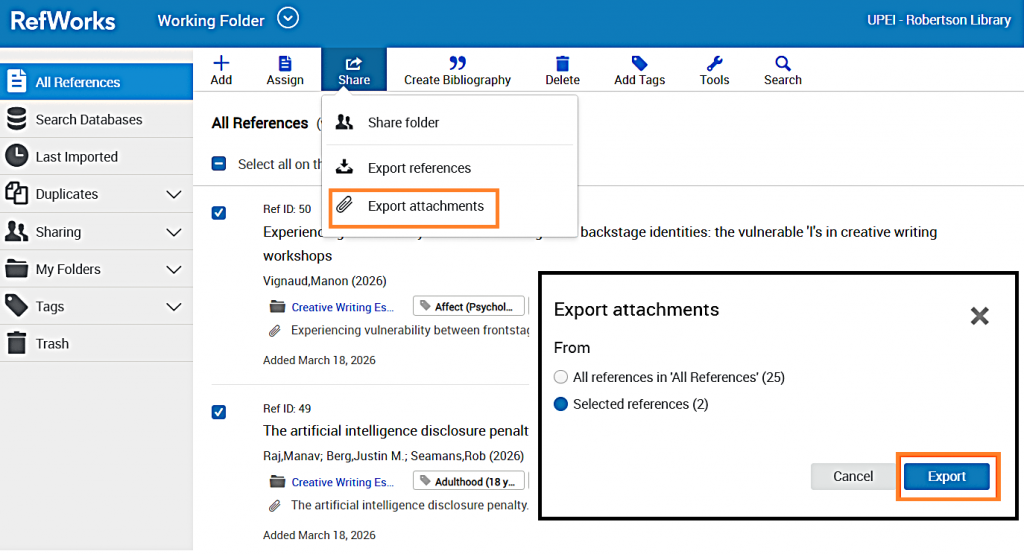 If you would like to download PDFs and other attachments for those same references, you’ll need to do that separately. Find the references with attachments you’d like to download, select “Share” again, and then choose “Export attachments.”