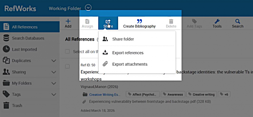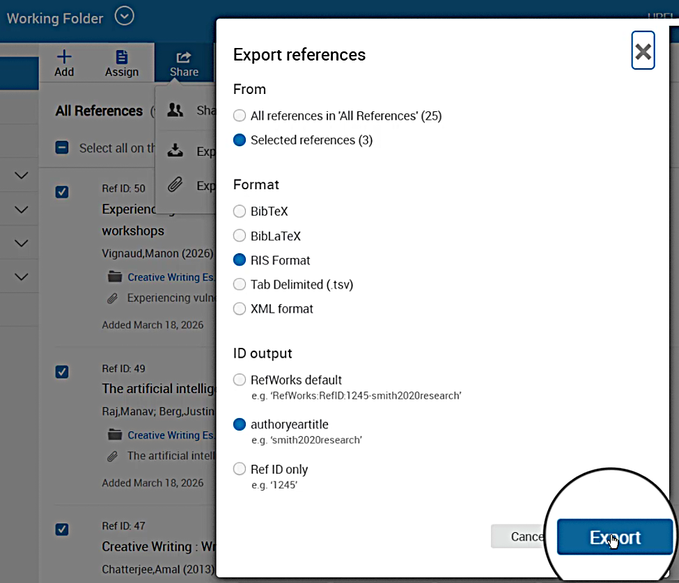 If you want to export only certain references, select them using the checkbox on the left, then select “Share.”