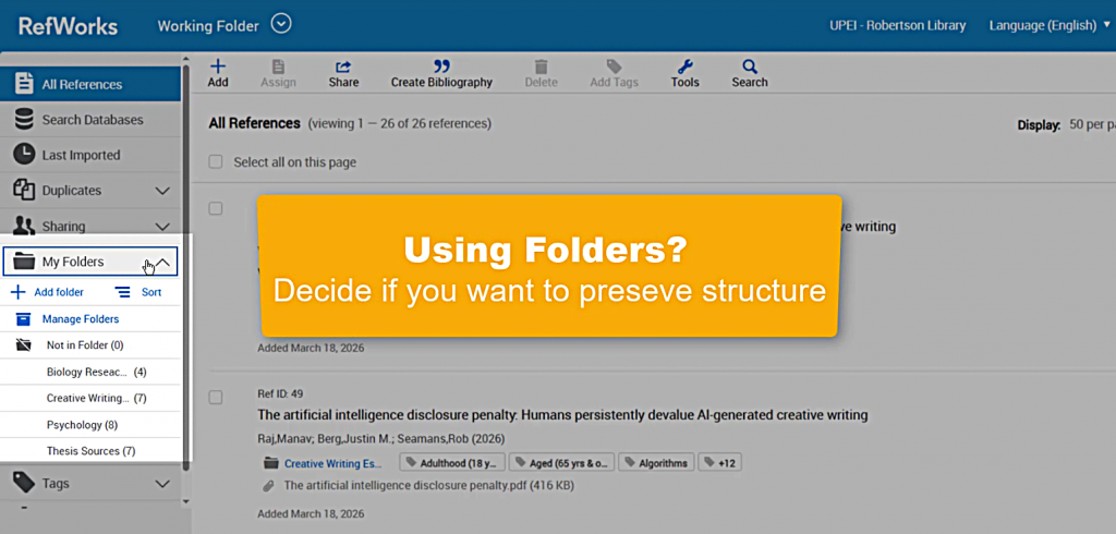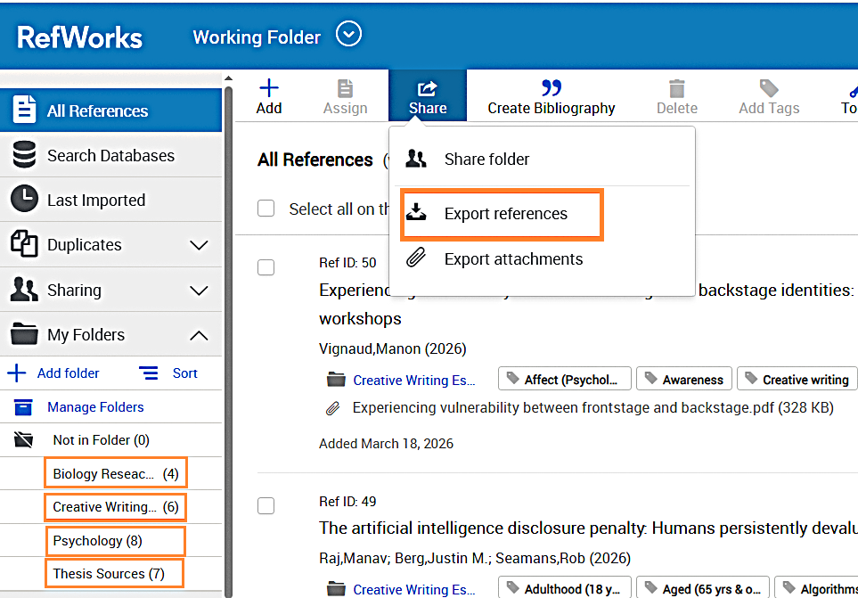 - If you use Folders in RefWorks, you will need to decide whether preserving your file structure is important. If you want to keep your references in their folders, you will need to export data from each of them separately.