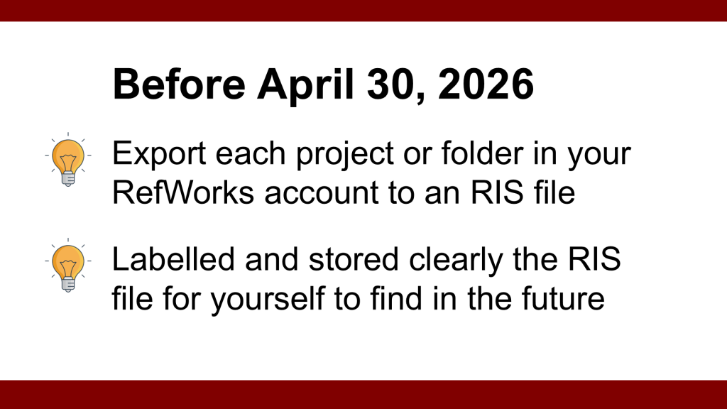 The most important thing you can do before the April 30th deadline is to export each project or folder in your RefWorks account to an RIS file that you have imported into Zotero or labelled and stored clearly for yourself to find in the future.
