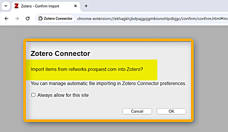 If you’ve already installed the Zotero Connector browser extension, it will offer to import your RefWorks items directly into Zotero.