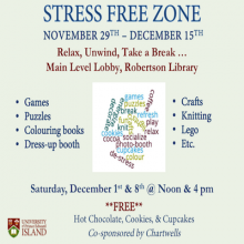 Back by popular demand, the Robertson Library is hosting the Stress Free Zone! Relax, play a game, colour, get crafty, smile for a selfie fashion shoot, get creative with Lego, and unwind in our beloved bean bag chairs.