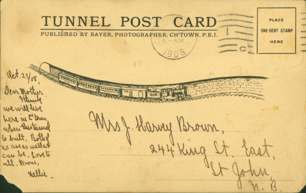 Today for the 8th day of 12 Days of PEI postcards we feature an Island pipedream that never was. The initial plans for an underwater railway tunnel can be traced back to a former senator, George Howlan, in the late 1800s with the construction of the Prince Edward Island Railway. This plan died out in the early 1900s, but as you can see from the sender of this postcard, they had plans to move to the Island when the tunnel was built.