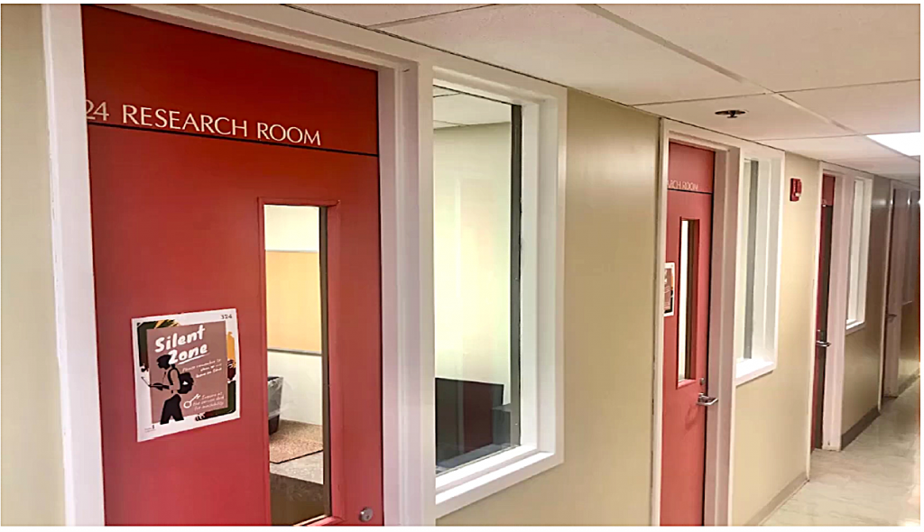 These rooms provide a quiet, distraction-free environment for solo study. Individual study rooms are part of the silent zone, meaning noise and talking are not allowed. Individual           study rooms are located on the upper floor of the library.