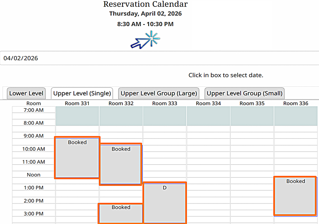 For example, to book a single study room, click the tab labeled "Upper Level (Single)." The room numbers will show up. Gray time slots indicate the room is already booked for that time.