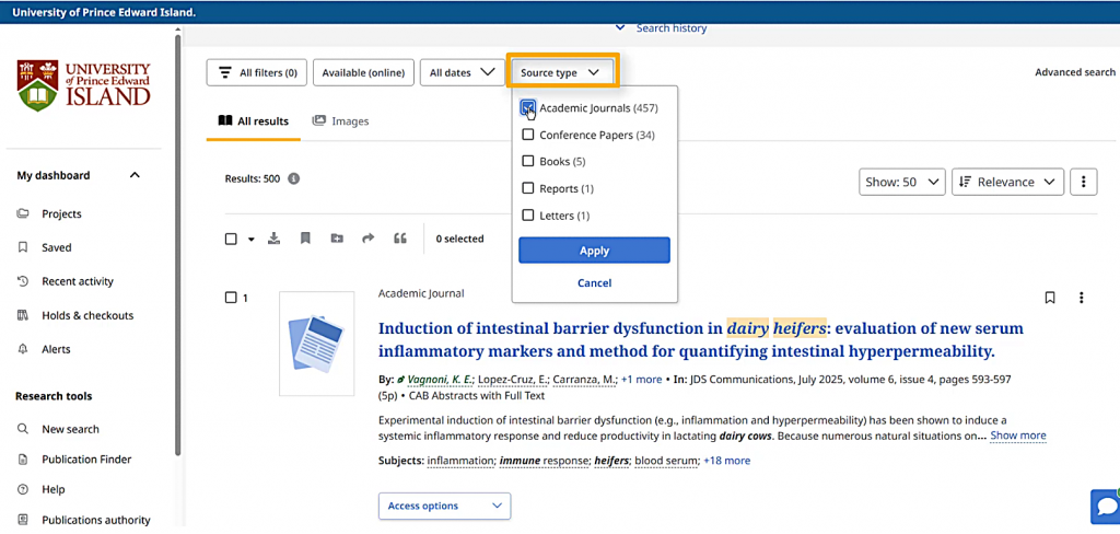 For example, I can choose only the results that are from Academic Journals by using the “Source type” option.