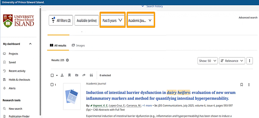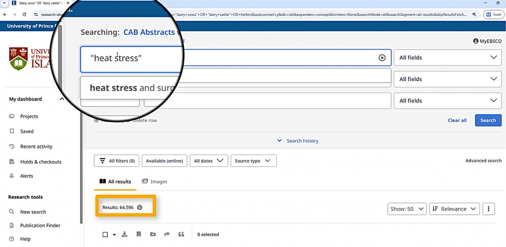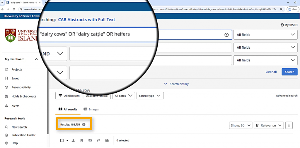 However, I also want to include other terms that might be used to refer to dairy cows, such as “dairy cattle” or “heifers.” I can add these with OR in between them, which tells the database that any one of those terms is relevant to me. Just like “dairy cows,” I’ll put “dairy cattle” in quotation marks. Heifers doesn’t need quotation marks since it’s a single word.