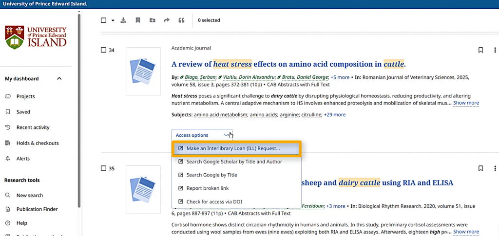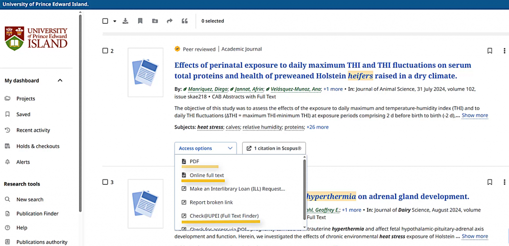 Each item has a dropdown menu labeled “Access options.” I can access the full text by choosing a link that mentions "full text," a file format such as PDF, or "Check@UPEI (Full Text Finder)". Different items might have different sets of links. The PDF and “Online full text” links will open in the current tab, while other links will open in a new tab or window.