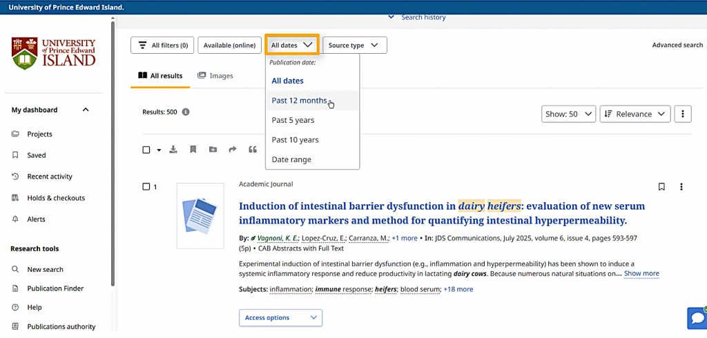 Under the “All dates” button, I can choose to only see results from the past 12 months, 5 years, or 10 years,