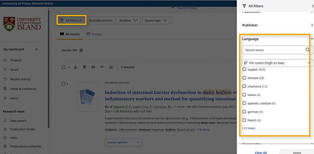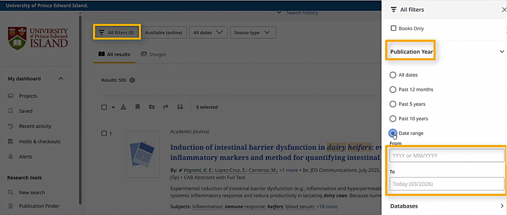 but I can also use the “All filters” button to open the filters window and set a more specific time period in the “Publication Year” section.