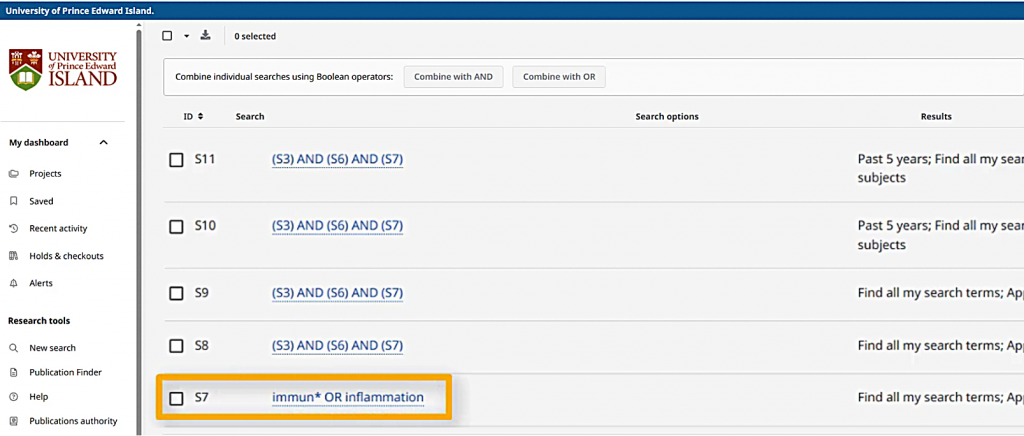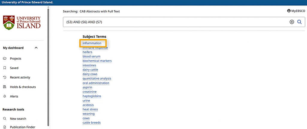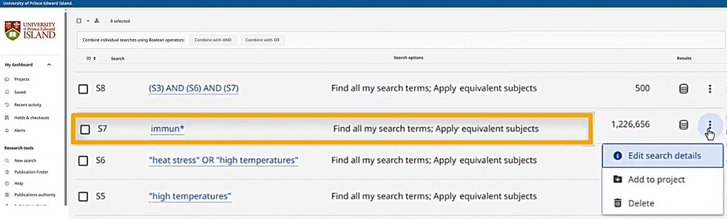 When I choose “Combine with AND,” a new search string will appear in my search box, referring to my past searches only by their numbers. This search gets about 500 search results, which should all have something to do with dairy cows, hot weather, and something related to the immune system.