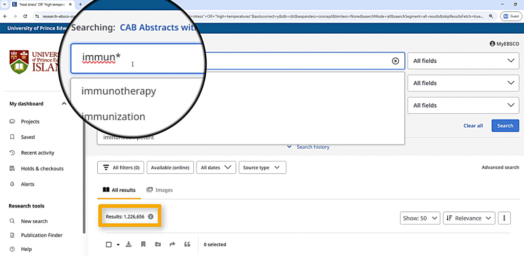 Finally, I want to find articles about the immune system, or immune response. I can search for any term that begins with the letters “immun” by searching for immun*. This will include immune system, immune response, immunity, immunodeficiency, and less relevant terms like immunization. That’s probably why it gets over one million results!