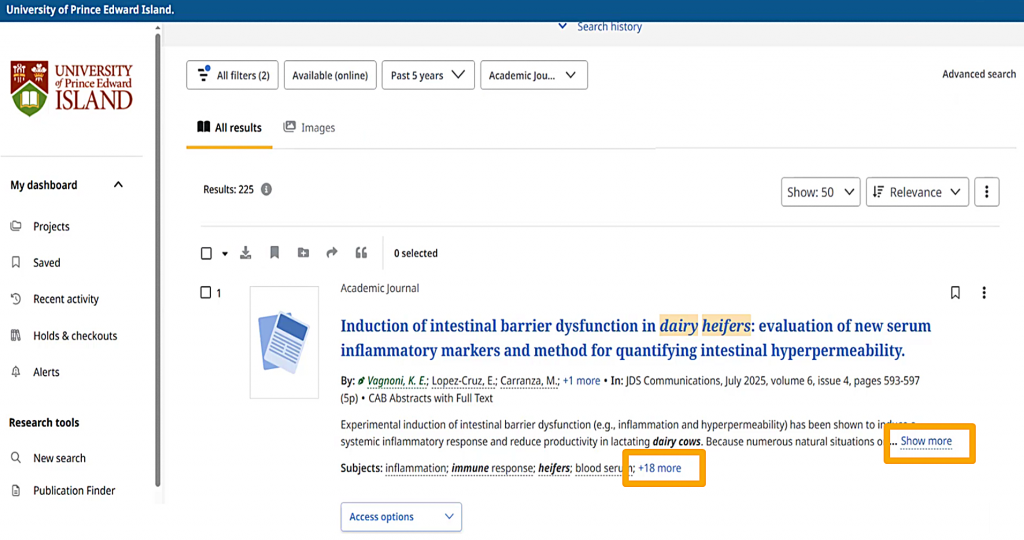 If I want to know more about a specific search result, the “show more” and “plus more” links show me more of the abstract and all of the subject terms.
