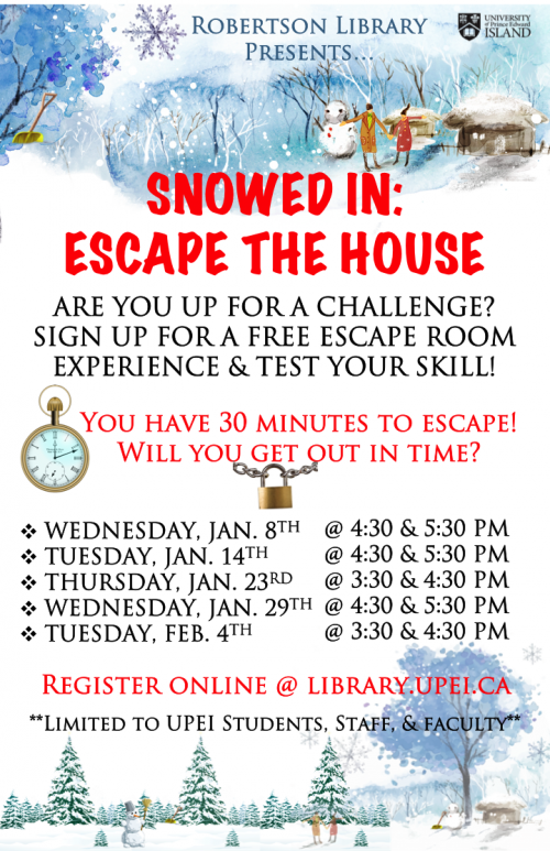 The Escape Room is limited to UPEI students, staff, and faculty and up to six participants per time. Free admission!