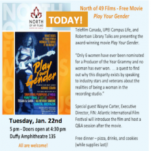 Telefilm Canada, UPEI Campus Life, and Robertson Library are presenting the award-winning movie Play Your Gender. The documentary, by Nova Scotia-based filmmaker Stephanie Clattenburg, is about the under-representation of women in the music industry.