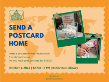 On Tuesday October 1, celebrate World Postcard Day from 12p-3p at the Robertson Library by writing a postcard to your family and friends back home. We provide the postcards, and we will mail them for free, anywhere in the world. Last semester, we sent 166 postcards!