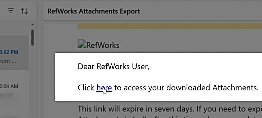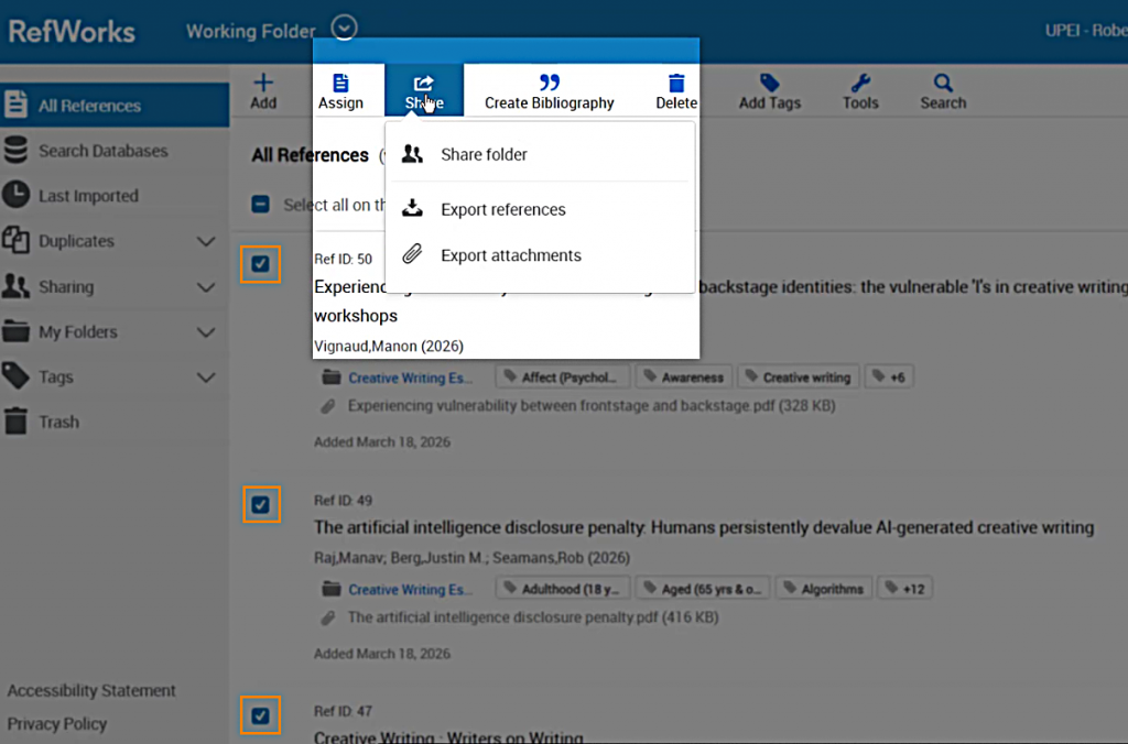 If you would like to download PDFs and other attachments for those same references, you’ll need to do that separately. Find the references with attachments you’d like to download, select “Share” again, and then choose “Export attachments.”