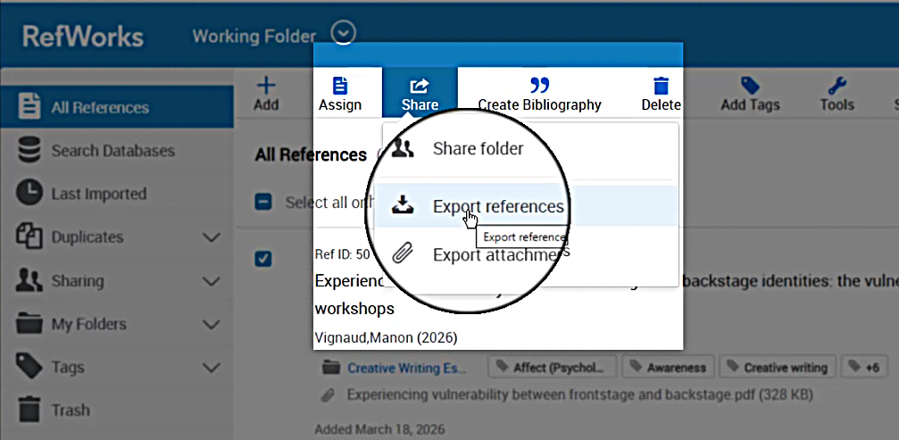 From the Share menu, choose “Export references.”